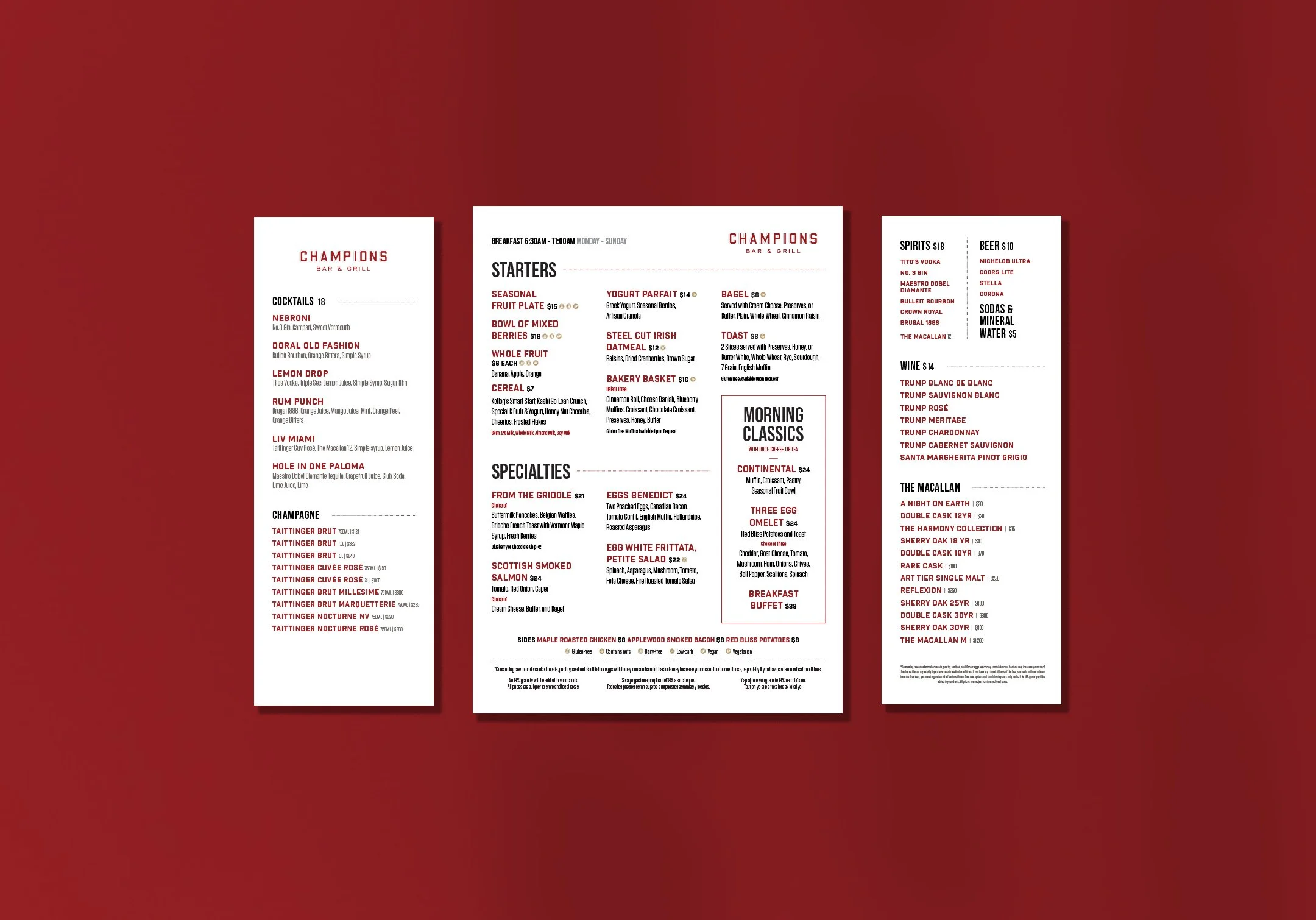 champions bar & grill MiamiThis rebranding project for Champions Bar & Grill focused on creating a fresh, modern identity that reflects the sophistication of the luxury hotel it resides in. The work included designing a new logo and updating all brand collateral to attract guest to the lower level of the property.